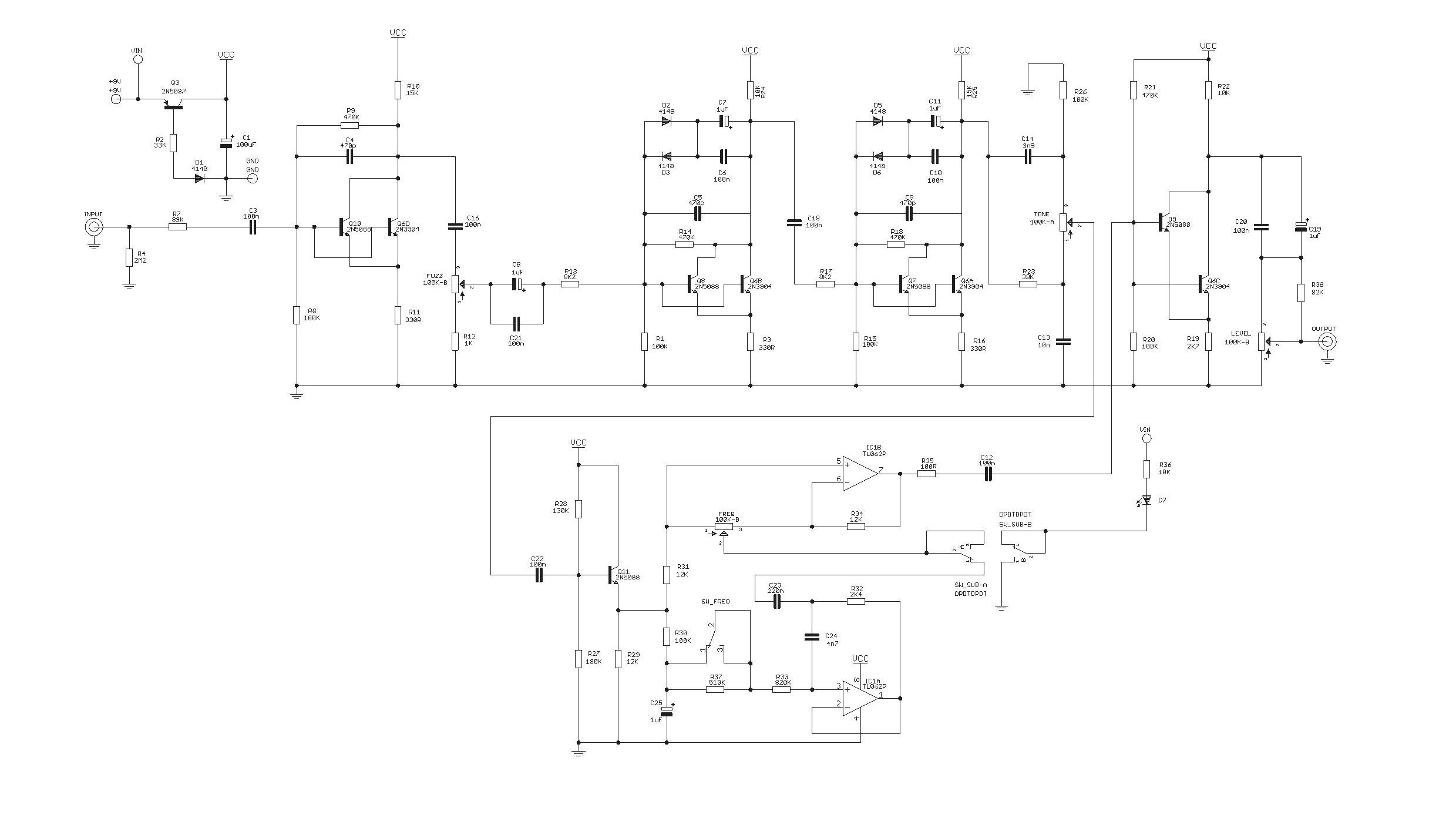 Решил отремонтировать сей девайс. Изначально педалька не работала вообще. Как выяснилось выгорел транзистор Q3. После замены (на аналог BC857) фуз заработал но возникает ВЧ генерация на частоте 1кГц сразу после подачи питания (пробовал и от кроны и от стабилизированного БП). Генерация срывается включением переключателя Deep (sw_sub по схеме), либо кратковременным касанием пальцем руки или конденсатором малой емокости контактов данного переключателя группы А (SW_SUB-A). После этой процедуры генерация не появляется до момента выключения питания. Не нажатии кнопки вкл/выкл, а именно отключения питания!. Т.е. физического отсоединения кроны или БП. При последующем подсоединении источника питания ситуация повторяется.