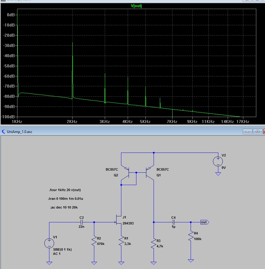 Просимил UniAmp 1.0 в LTSpice : и таблично и в FFT вторая гармоник 3% при входном 1 вольт (каскад даёт усиление примерно 6.5 дБ).