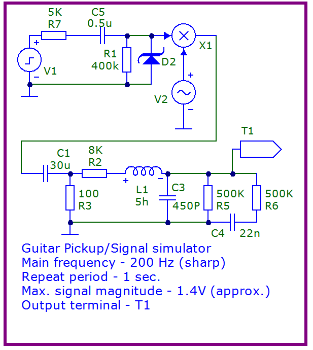 Вот, простейшая модель гитарного сигнала (без звукоснимателей), всё остальное - датчики, крутилки, кабель и т.п. - допиливается как в схеме из стартового поста.