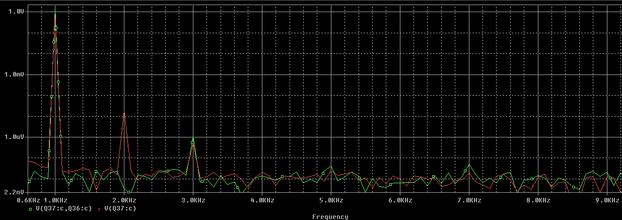 В LTSpice тоже FFT.  Вот результат измерения первых 10-ти гармоник от 1 кГц и суммарный THD