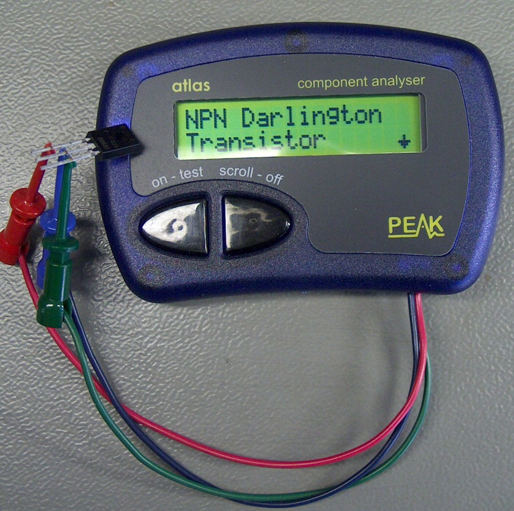 Имеет 3 щупа с зажимчиками, подключаешь любой двух или трёхполюсник и он тебе выдаёт всю поднаготную. Например : подключил (как попало естественно) клеммы к чему-то типа транзистора - он выдал :  NPN Darlington Transistor, цоколёвка такая-то, Diode protection B-C, Resistor Shunt B-E, H21e = 100, Test current =2 mA, Ube=1.3V, Test current =3 mA, leakage current =0mA,