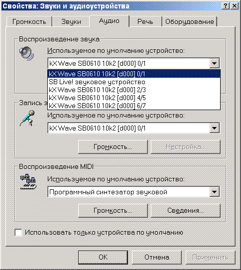 Панель управления > Звуки и аудиоустройства > Аудио > Используемое по умолчанию аудиоустройство.