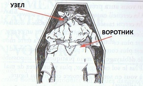 3) Скрестите руки на груди, схватив ладонями плечи и стяните с себя рубашку или майку вверх (см. рис.) завяжите её узлом над головой ; вися мешком у вас на голове, она защитит вас от удушья при попадании в лицо земли.