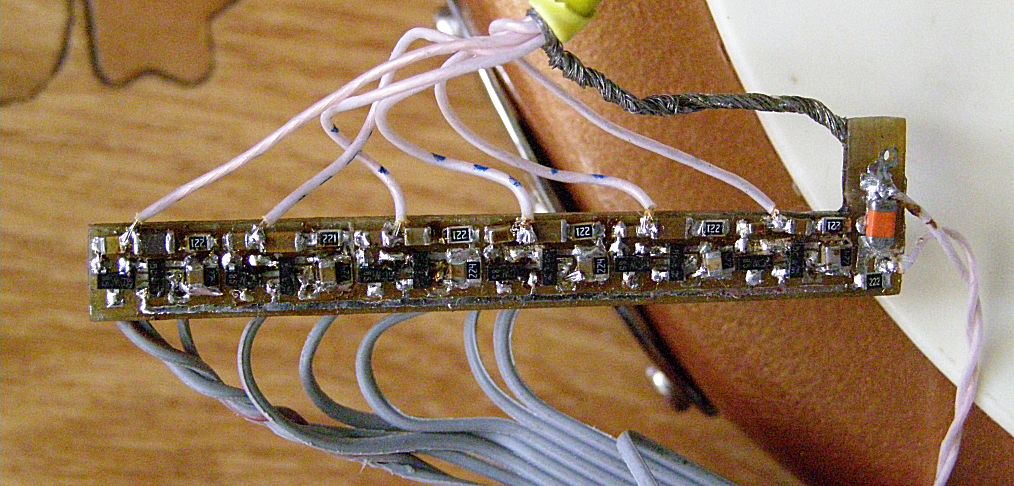 Как 6-канальный дисторшн, был использован уже имеющийся в бревне один из работавший с 6-канальным звукоснимателем вариант платки, склепанный в 2008-м году - инвертирующие ЛУ на LM324 и регуляторы гейна на КП103.