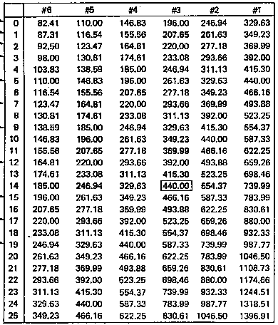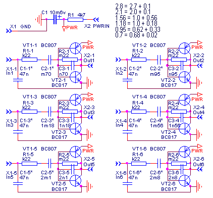 Преампы сделаны по вот той комплементарно-двухтранзисторной схемке использованной коллегой Peratron, модифицированной для полосового фильтра 1-го порядка с канальными полосами от 1 лада до 20-го, так как необходимо ослабить как НЧ, чтобы подавить выбросы постоянной составляющей, так и ВЧ, уменьшив шум. Таблица частот стандартного строя гитары прилагается.