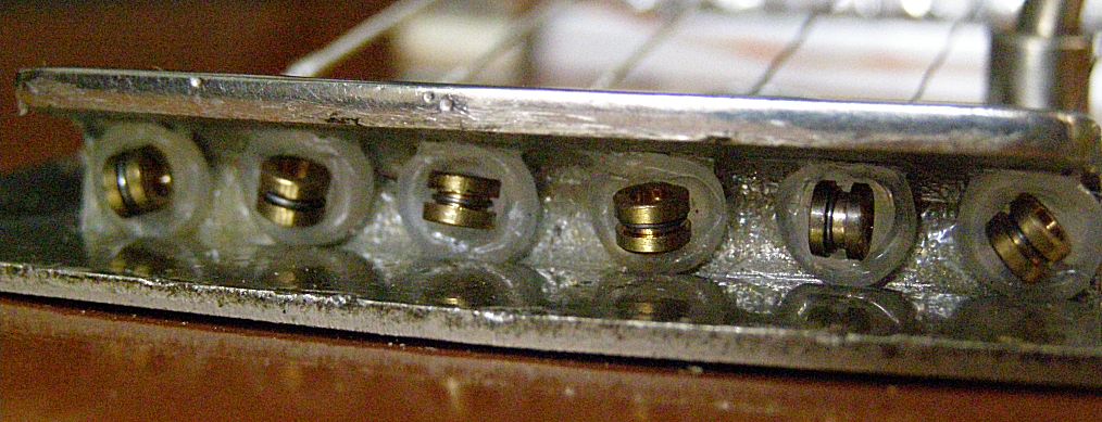 Бридж раньше был родным - деревянным с кусочками ладов под струнами, но позже был сделан металлический с колесиками. Вот с ним и пришлось поработать по части изоляции струн шайбами и прокладками. Заодно на нем и должна устанавливаться платка с контактами для сьема  и преампом.