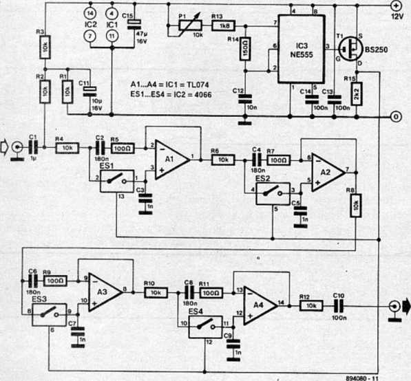 Фильтр четвертого порядка на схеме может использоваться по всему звуковому диапазону и имеет усиление около 40, хотя это в некоторой степени зависит от тактовой частоты. Полоса пропускания зависит в основном от заданной частоты.