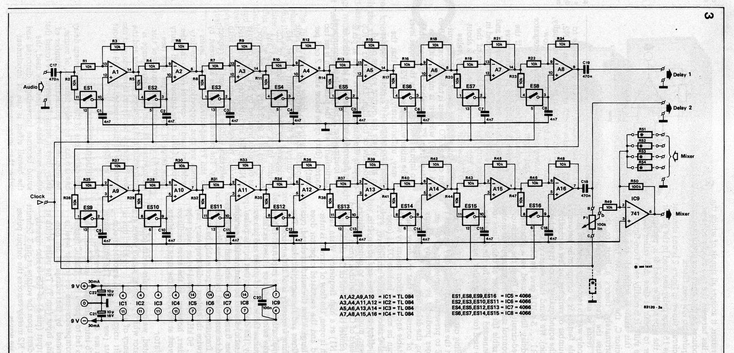 Схема, показанная на рисунке 2, является одним из элементов 16-каскадной линии задержки, используемой в фейзере.