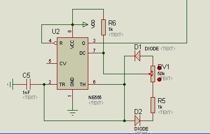 Ширина импульса на выходе (вывод 6) IC5 также напрямую зависит от напряжения на выводе 3. Триггер Шмитта N2 просто восстанавливает выходные импульсы в виде прямоугольных импульсов.