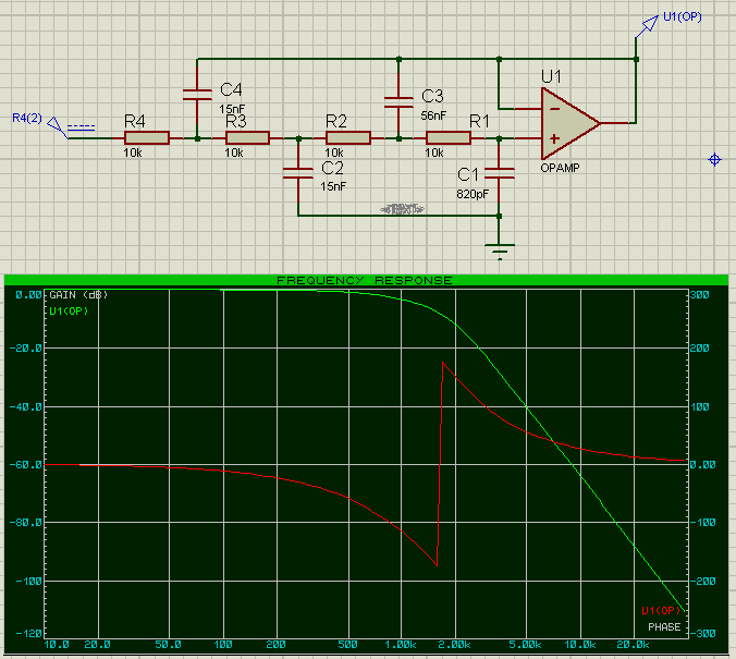 Схема с упрощенными номиналами, АЧХ/ФЧХ, и сам протеусный (7.хх) проект (с фиксированными резюками) ниже.