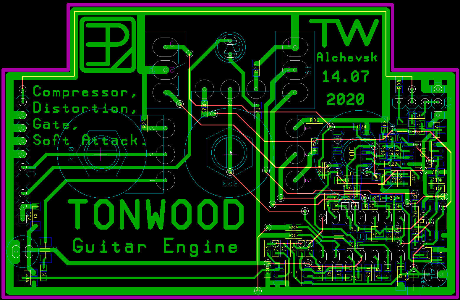 Она, вообще-то, односторонняя, второй слой - перемычки. Особо "вылизывать" разводку было некогда. По ходу пьесы пришлось навесить пару хомутов и на стороне монтажа в первом экземпляре, они уже учтены в приведенных здесь схеме и плате.