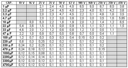 Мой метер показывает только величину ESR в омах, а не исправность конденсатора. Для определения исправен ли конденсатор, по напряжению и емкости, смотрю в примерно такую таблицу: