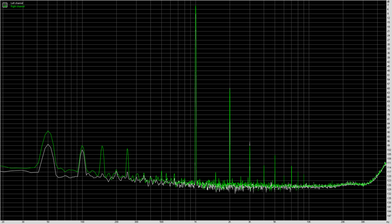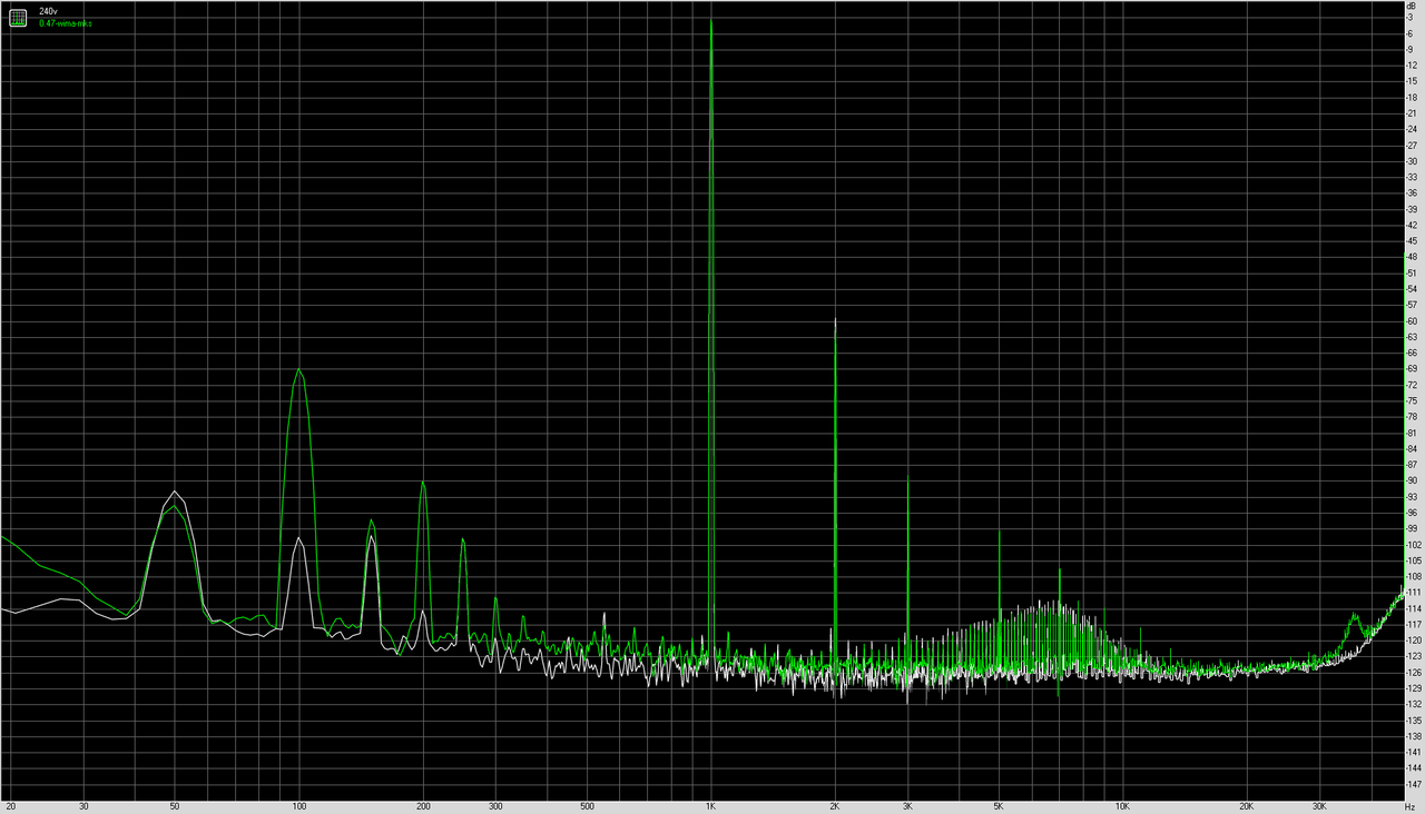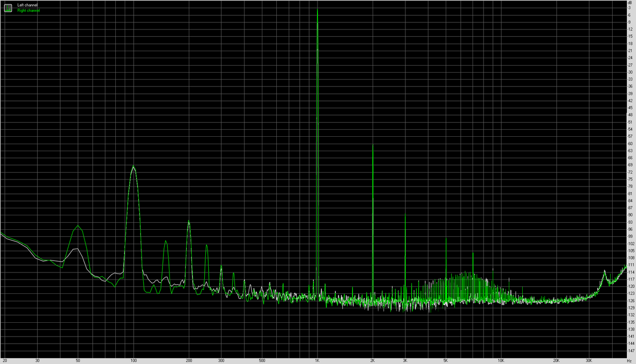 С "шерстью" получилось целое приключение. Сперва, подсмотрев у товарищей в интернетах, попробовал костыли. Ну типа ферритных трубок и типа того на сеточных проводах. Не помогло. Потом пикушки. Тоже нет. Задолбался RMAA запускать после каждой пайки, открыл Арту на анализе спектра в реальном времени. И тут увидел что при включении, "шерсть" встаёт дыбом, потом спадает. Когда питание отключено - "шерсти нет". Ага, раз лампы холодные, анодную не берут, значит накал. Тут я вспомнил диоды, которыми "сбиваю" напряжение. С радостью расковырял весь монтаж, включаю без них - тоже самое :(. Ну, думаю, лампы не дорогие, отключим подьём, если прошьёт - есть другая б.у. Отключил - весь спектр один лес. Начал смотреть "подьём", а там ... По каким-то, самому неясным причинам - я, оказывается, тупо не протянул минус до конденсатора который стоит после делителя :). А напряжение для поднятия, беру у первого кондера, где самое "грязное" питание. Подцепил проводок и всё, никакой "шерсти".  Вот результат (на слух не услышал разницы):