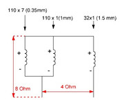Только сейчас обратил внимание, ...провод 0,35 мм, это эквивалент всех параллельных всего на 0,89 мм одного провода. Смысла в твоей схеме нет, так изощряться. Мотай 78 витков 1,8 мм, продолжение 32 витка 0,89 мм и параллельно заводской, ...всё.