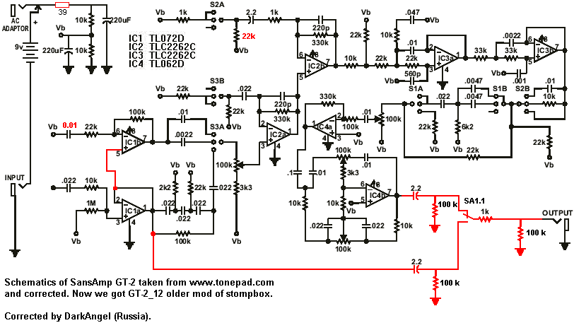 Собрал свою первую примочку "Sansamp GT-2". Возникли некоторые проблемы при подключении кнопки (2PDT), с милениуемым байпассом и без него, на большом гейне возникает писк. Кнопка не ахти какая (Taiwan). Провода входа/выхода не экранированные пока.