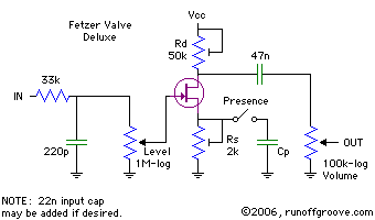 Ведь питание в моём случае не ограничивается 9в, ЕМНИП J201 - (если надо) терпит аж до 50в, что не сложно устроить в ламповом усилителе (при таких мизерных токах потребления). Значит и усиление можно сделать соответствующее. Чтоб чересчур не перегружать вход - что мешает делитель поставить? По аналогии потенциометра уровня в данной картинке: