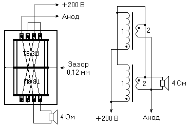 Ничего не понятно. Ты же вроде пуш пул собрался делать, а схему нарисовал для однотактника, просто трансы впараллель. Кстати, тоже работать не будет т.к. обмотки намотаны встречно и если нало с началом, то получается последовательное соединение, динамик вобще в анодную цепь включен... Деранет не хило если на включенном взяться за джек опираясь другой рукой на шасси. Короче, аудиопортальщина получается какая-то. Они там практиковали, что-то подобное и писались от счастья друг перед другом. А лечится эта аудиофилия просто. Трансформаторы оставляем соединеными встык, чем ближе друг к другу,тем лучше. Никаких прокладок! Это пуш-пул, а не однотакт. Чем плотнее прижаты ТВЗ-шники друг к другу тем лучше. Далее, вторичку соединяем последовательно, разные номера (например, 3 и 4, а также 4 и 3), т.к. катушки намотаны в разные стороны при сложении, получится электрически параллельное соединение, и выводим на динамик 4 Ом. С первичкой поступаем также, соединяем одноименные номера выводов 1 и 1 это будет + питания. А вот оба номера 2, с разных катушек пускаем на аноды выходных ламп. Должно получитья. Хотя лучшее решение перемотать транс внавал и собрать вперекрышку. Это будет и оптимально, правильно и голову ломать не придется над хитрыми соединениеми. Да и для опыта очень полезно. Проволоки с 2х трансов вполне хватит на один правильный. А избыточная индуктивность того, что ты собираешься делать, к хорошему звуку не приведет. Бухать будет по низам, а красивого плотного гитарного низа не будет. Я бы перемотал. Лень не двигатель прогресса она его тормоз ;)