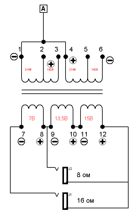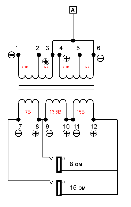 В первичке нужно соединять плюсы с минусами, так как на полной обмотке должен быть двойной размах напряжения.