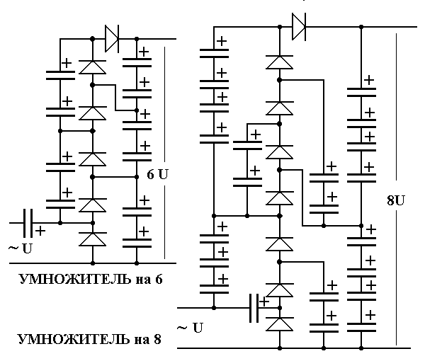 Конденсаторы одинаковой ёмкости. Только имей в виду, на приведённых схемах последовательное соединение конденсаторов указано "схематично", оно отражает тот факт, что где два конденсатора - это значит, что на них удвоенное напряжение, где три - утроенное и т.д.. В реальной схеме досаточно выбрать кондёр на нужное напряжение, и лучше с сильным запасом. Ещё беда: чем больше кратность умножения, тем сильнее падает мощность такого БП и требуется стольки же кратное увеличение ёмкостей. Из опыта, уже 3-кратное умножение приводит к серьёзным потерям. 6-8-кратное я бы делать не стал, в виду крайне малой эффективности. Для звука такой "БП" - это вообще зло, т.к. нагрузка питается последовательной батареей конденсаторов, которые как известно качества не добавляют и при таком включении дают высокое Rвнутр, да ещё и постоянно переключаются кучей диодов.