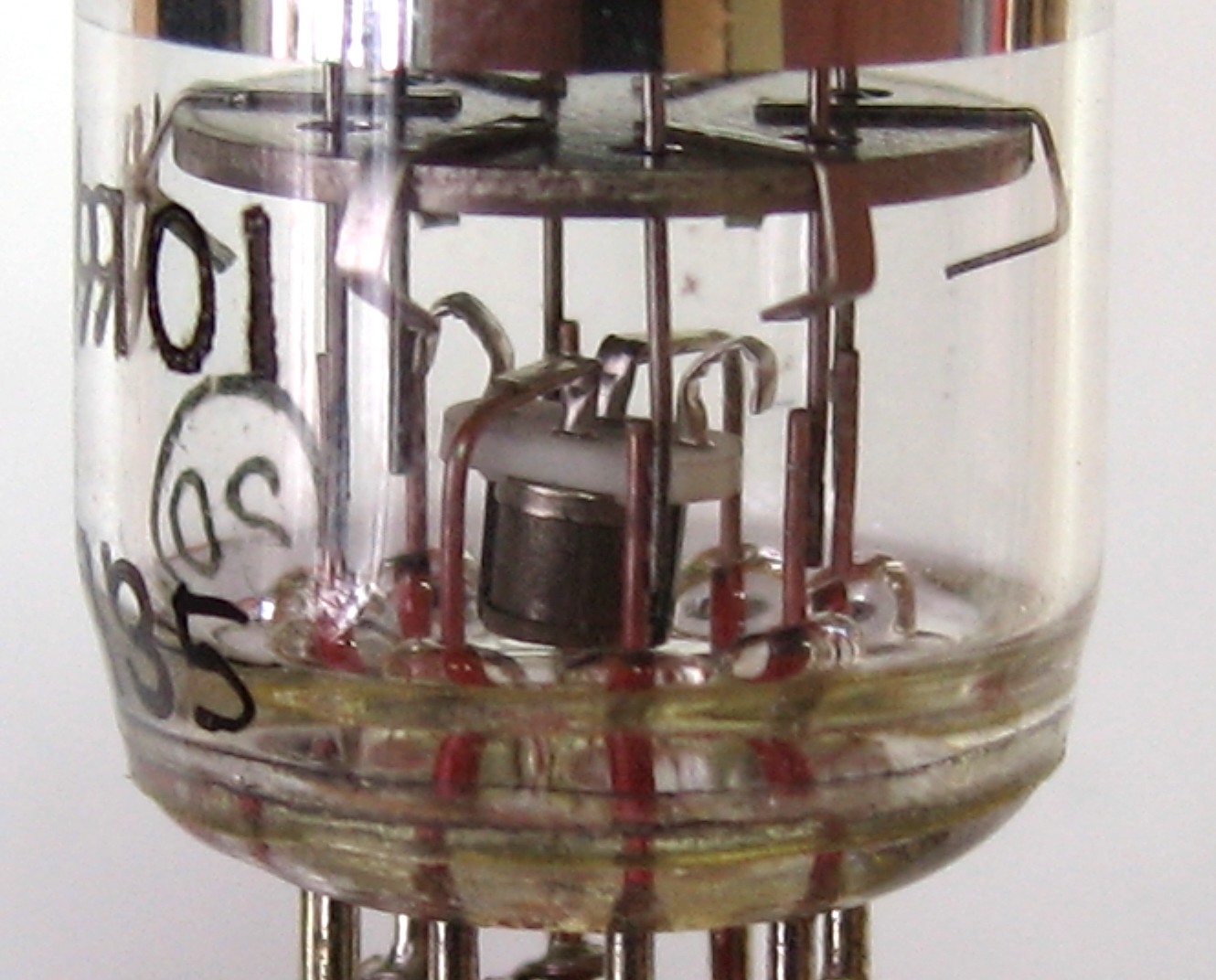 Никаких обозначений на корпусе нет. Стеклянный цоколь, семь штырьков, сверху алюминиевый колпачек, который держится на двух проволочках. Внутри темный кристалл, держится (точнее болтается  :) ) на трех проводках. Судя по всему - транзистор. Но что за странная конструкция, и почему выглядит так - будто лампу вытащил, и его вставил. Может кто знает?