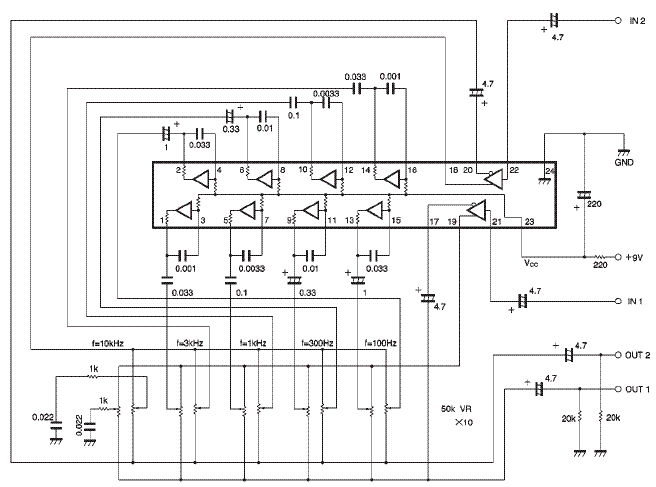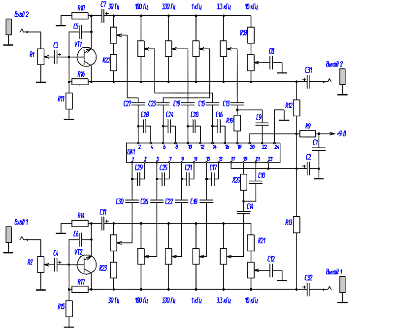Рис. 1. Схема 2-х канального 6-ти полосного эквалайзера.