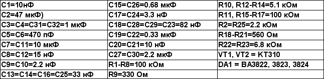 Я использовал переменные резисторы типа F09125G фирмы Polyshine Holdings, но никто не мешает Вам использовать и любые другие, например движковые – NSL102N (по каталогу магазина «Chip-Dip»). Микросхема BA3822 в тип-размере SZIP24 (рис. 3). Резисторы мощностью 0.25 Вт (R19, R20 устанавливать вертикально), конденсаторы номинальным напряжением 16В...50В. Никаких настроек и дополнительных требований – нет.