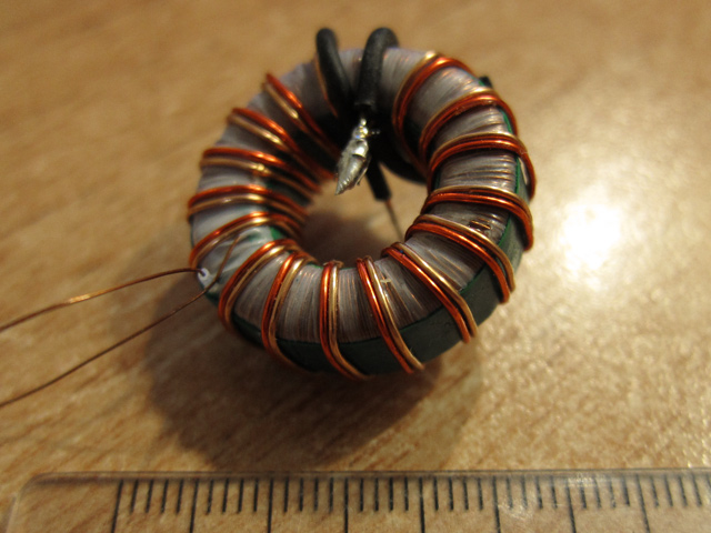 Многовитковая обмотка поверх кольца без изоляции. Перед её вторым слоем виток изоленты снаружи и внутри кольца, так лучше ложится провод. Затем фторопластовая лента в 2 прохода, и обмотка толстым проводом. Я беру разных цветов и мотаю двойным сразу, так проще коммутировать.