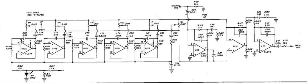 При заземлённом входе схемы (отметка "MAIN BUS", стоит потенциометр гайна с одним концом в "землю"), постоянный фон присутствует (в слышимом виде). Полагаю, что что-то высохло, не контачит или "поплыло" и в последствии имеем земляную петлю, которая ловит излучение от силового трансформатора. Если подключить источник сигнала к разъёму P.A. IN (вход УМ, синяя стрелка), фона нет. Вечером, надеюсь - доберусь до схемы с осциллографом, но по слуху смахивает на 50 а не на 100гц.