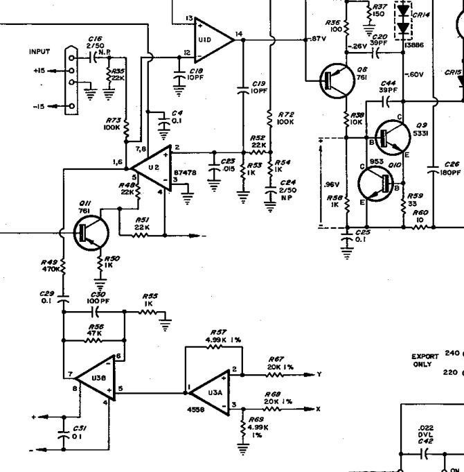 А вот разглядев внимательно схему появился вопрос насчёт 6-й ноги U9b. Никогда в сумматорах не видел разделительных конденсаторов(С33). Как-то странно. И R45 для чего? С другой стороны почему бы и нет(хотя всё же ооочень странный узел). С33 проверялся(или менялся)?