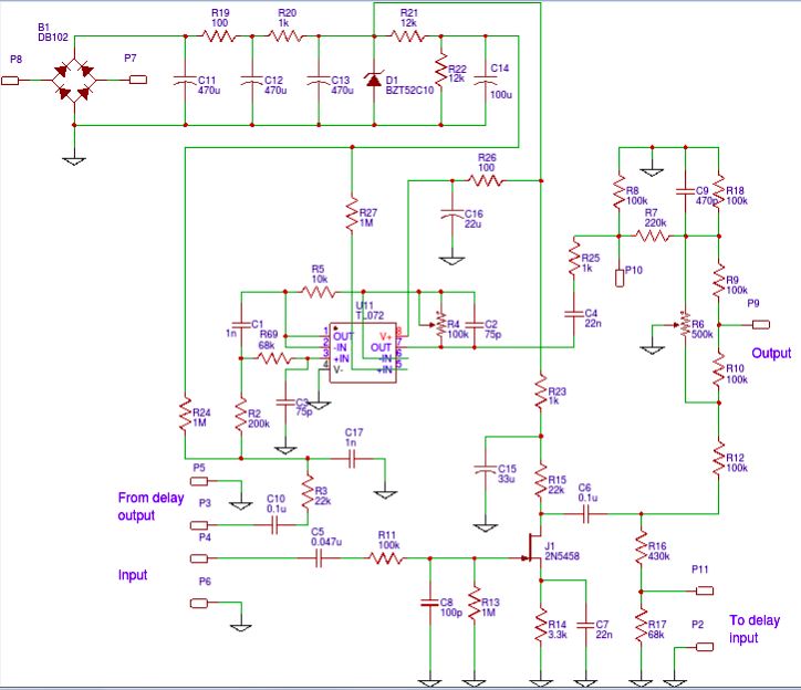 Схема представляет собой модуль подключаемый к модулю задержки от Uncle Cherry. В совокупности эмулирует ленточный Maestro Echoplex EP3, у которого заимстован входной каскад-бустер и высокоомный смеситель. От себя заложил ФНЧ второго порядка который при желании можно "байпасить" и усилитель задержаного сигнала.