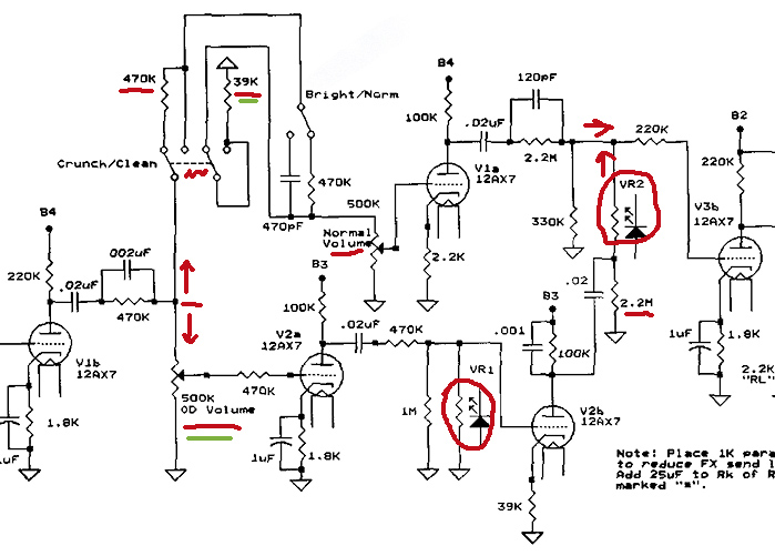 Я вижу в сло есть чистый канал, как я хотел. Там стоит переключатель clean/crunch который шунтирует резистор 470к, видимо меняя выходное сопротивление прошлой лампы, чтобы были искажения.