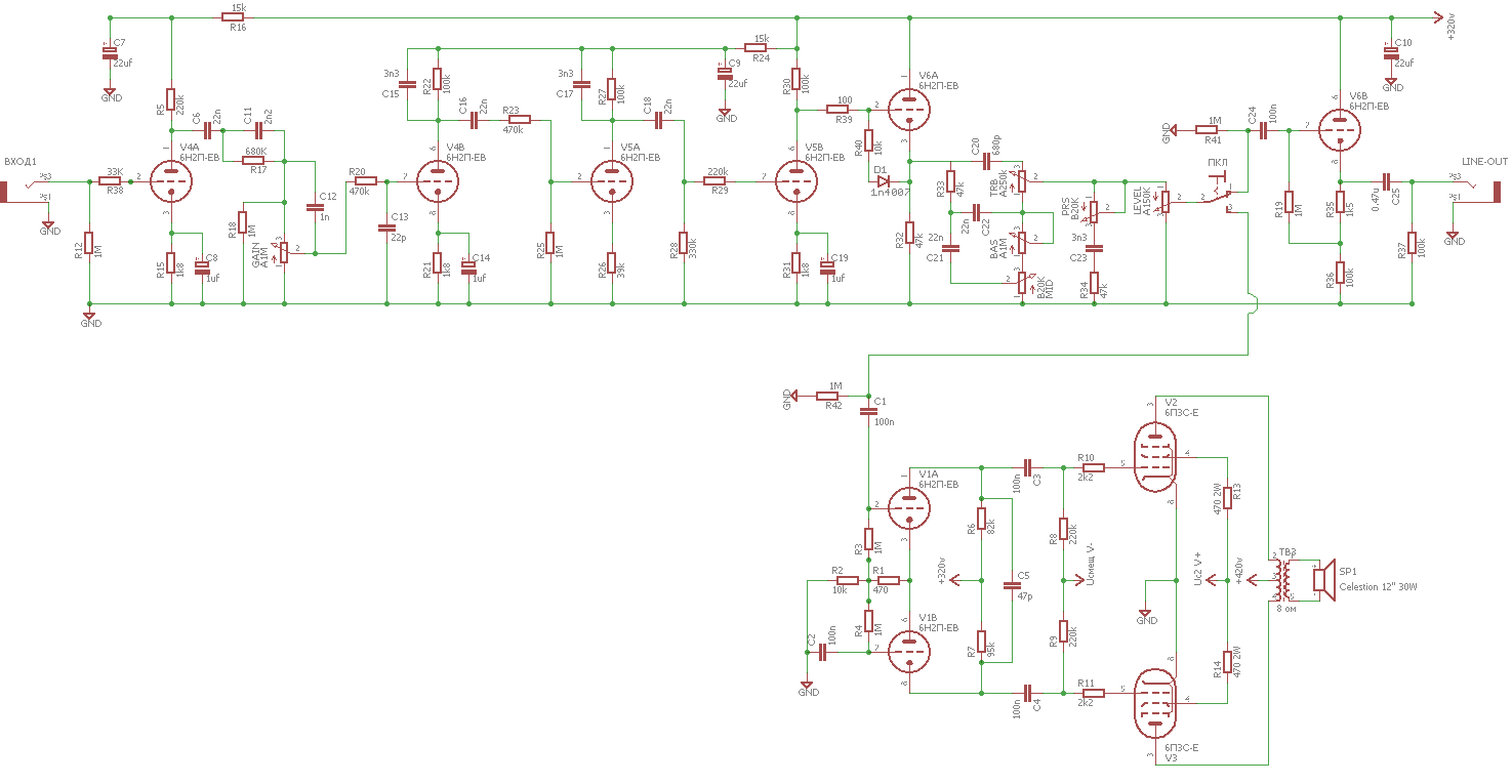 - я обладатель ламп 6н2пев и пары 6п3се хочу сделать усилитель из них, печатка и схема преампа у меня уже есть. но нет усилителя мощности. и не из чего сделать питание. вот я еще схему нарисовал.