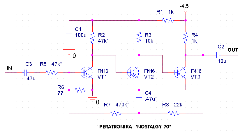 Она мне другое напинает ;D Армейка, Комсомольск-на-Амуре и библиотека ВЧ, где кроме муРзилки ничего не сыскать. Так что настольгия реальная. Схемка предназначалась как микрофонный усил для снятия сейсмических колебаний на инфра НЧ. Транзисторы в оригинале - МП16, резистора ?? - на самом деле нету, вместо него резистор ОС  в эмитере - 0 - 33 Ом. еще стабилитрон Д808 в питании 1-х каскадов.   Но это не мешало нашим Кулибиным пристроить ее для своих нужд.  Что нам  "стоить дом построить"(с).  Суровый "Урал" на ней звучал как психодел-машина, заводился с полуслова ... ;D - проверено. Так что совок - forever!