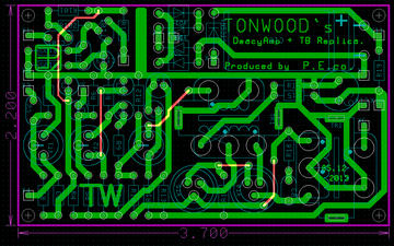 Схема на данный момент почти полностью соответствует вчера запущенному дивайсу, но, скорее всего, будет немного изменена. Ведь главная фишка этого усилка - не только относительно мягкий перегруз, но и распределенная компрессия гитарного сигнала за счет падения напряжения питания на перегрузе, и соответствующего уменьшении общего усиления. Конечно, у Мэя все это получилось эмпирически, но сколько уж народа поисследовало этот усилочек, найденный, по легенде, Диконом, на мусорке. ;-)