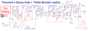 Особо умничать не стал - сделал свою модификацию Deacy Amp. Главное отличие - плюсовое питание, совдеповские транзисторы и непредусмотренный в оригинале ЭП, а также Treble Buster, якобы идентичный Мэевскому - все в куче.