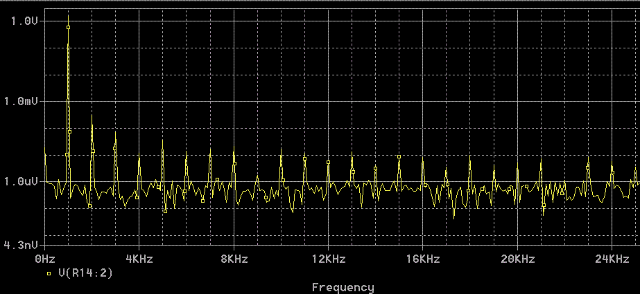 Как видим, здесь вторая гармоза на уровне -73 дБ, что соответствует уровню THD примерно 0.03%. То есть, типичному для электронных схем с применением ОУ.