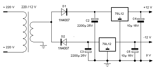 не пойму, в чём проблема с двухполярным питанием? :-? всё равно городить виртуальный ноль... а так даже проще: бп - просто понижающий трансформатор, а выпрямление и стабилизация такие: