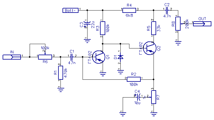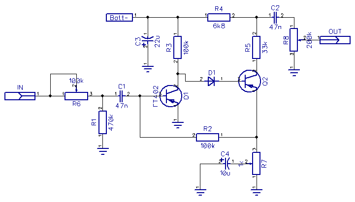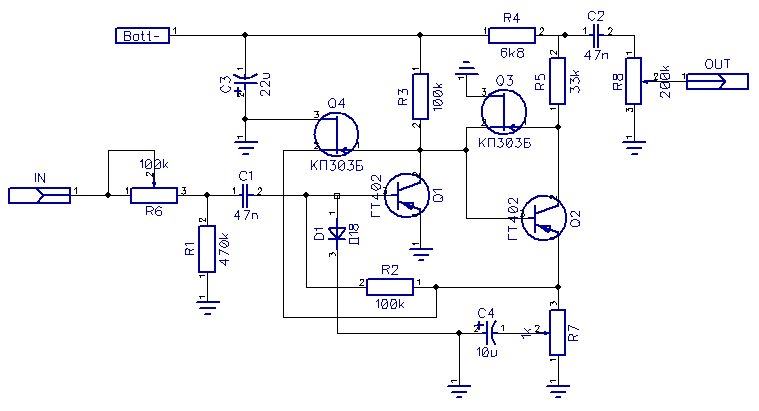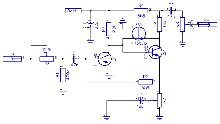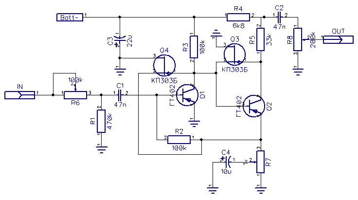 А что разве картинка пропала? У меня высвечивает. А полное описание в Радио - №6-69, с. 47., там же тэмброблок и БП, но я испытывал без ТБ.  Повторюсь, к этой схеме применить твой каскад без повторителя, попробовать что получиться, а потом может, перед ним еще один каскад но уже с повторителем. Но это первый прикид.