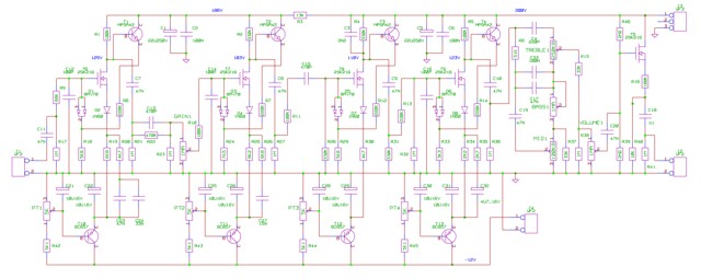 Несколько дней крутил межкаскадку и так и эдак. в результате оставил все, как есть. Именно для ректы ничего менять не нужно. Единственное, девайс немного "верхастый" (именно верхастый, не звонкий), что успешно лечится установкой кондерчиков 47-470пф (по вкусу) между затворами и землей транзисторов 2N7000. Еще я поставил повторители (до и после слошного темброблока) на КП303Е, они более подходящи для этих целей :) Презенс имитировал цепочкой 4n7 и 47к об землю до регулятора громкости.