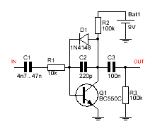 А не сделать ли на них что-нибудь простенькое, на две ручки, в духе "MXR Distortion +"? Подумал, и нарисовал такую схему: