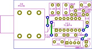 я развел печатку, но не для TL074, а для двух 072 и под двухполярное питание. В устройствах с небольшим усилением я предпочитаю толстые дорожки. Детали неподписаны, но там и так всё понятно, с левой стороны платы впаивается выходное гнездо. Шумов от спикерсима полный ноль если помими кондеров в блоке питания ещё и на плату посадить, для этого рядом с гнездом есть посадочные места для электролитов. По поводу звука: на мой взгляд это лучший спикерсим, мне нравится даже больше магнума.