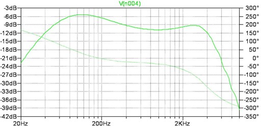 По моему слишком большой модъем в районе резонанса дина и слишком малое затухание после него к низам. В реале схема сильно "басит". Я заменил кондеры перед первым каскадом фильтра 22n на 10n и после него 100n на 47n и получилась следующая ачх: