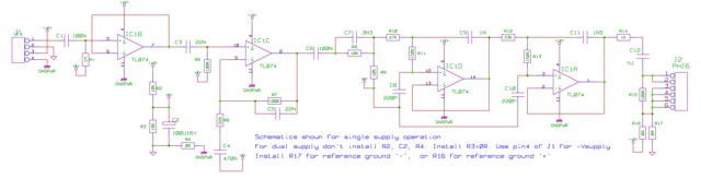 R3,R7 нужно будет пустить не на землю, а на 1/2 питания (см. любую однополярную схему, например  http://forum.gtlab.net/cgi-bin/yabb2/YaBB.pl?num=1246201423/195#195 пост201, детали R1,R2 и С2), а кроме того добавить на вход первого операционника цепочку, аналогичную С1(0,1мкФ) и R3, причем новый R3  - тоже на 1/2 питания (на приведенном примере называется +5v).