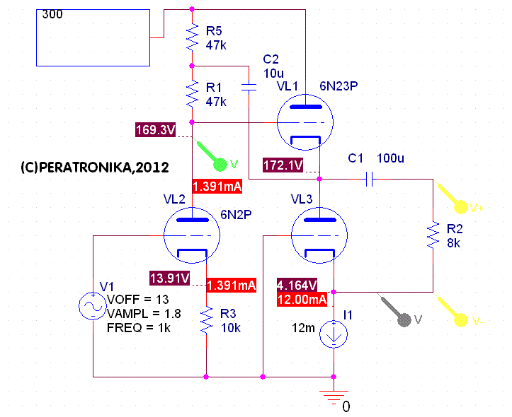 - входное напряжение близко к тому, что получается в сабжевом усилителе, или в варианте SRPP