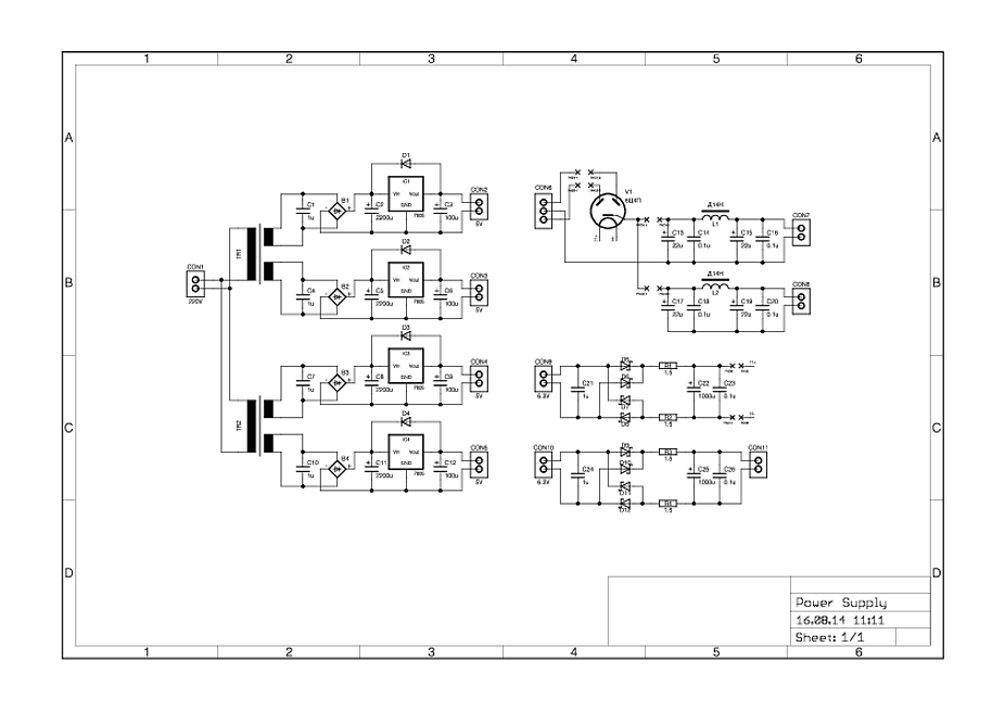 Итак схему я перерисовал для ДППВ. Один кенотрон, два дросселя. Кстати насчет электролитов... Если сразу после кена я не могу ставить большую емкость, то после дросселя это ограничение снимается. Так вот вопрос как лучше. Оставить после дросселя 22 мкф а на плате усилителя нагородить 2 емкости по 180 мкф? Или сразу поставить на плате питания 180 мкф?