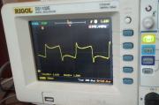А вот с серединой - не пошло. Я разозлился и начал программировать резонансный фильтр :). За основу взял идею из http://we.easyelectronics.ru/Soft/prostoy-polosovoy-filtr.html  - естественно, доработал до нужных кондиций. Оказалось - работает, можно настроить добротность, частоту и уровень сигнала. Получилось неплохо, хотя и не совсем классически (Маршалл в Jackhammer  сделал что-то похожее). Покрутил на реальном сигнале и получил вот такие картинки (на входе - синус, он ограничен почти до прямоугольника) - ИМХО таки похоже на осциллограммы реальной примочки:
