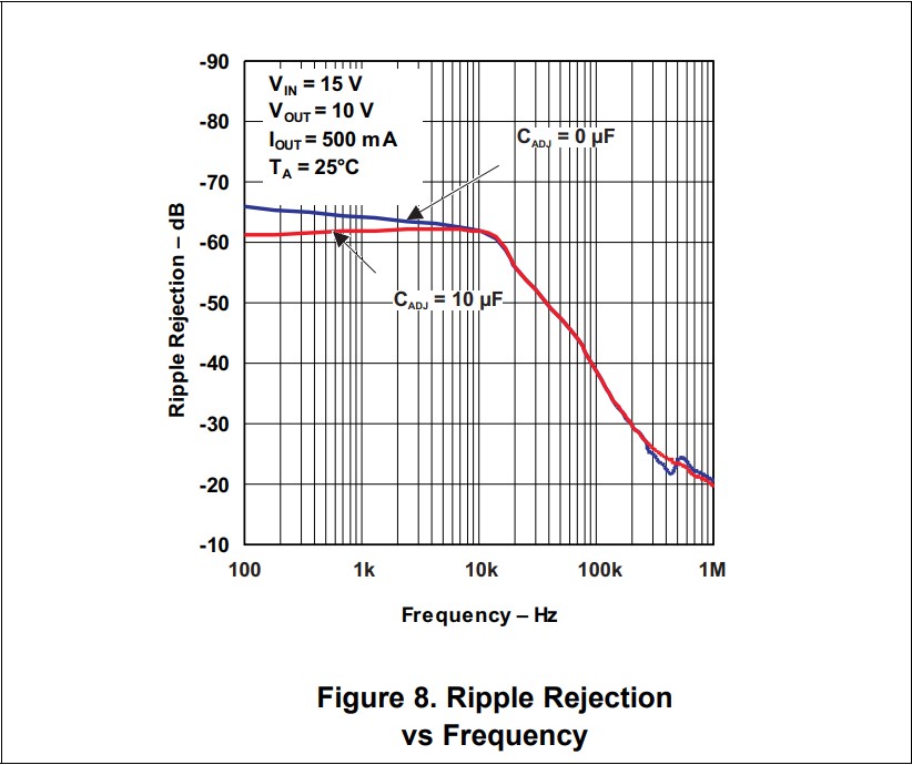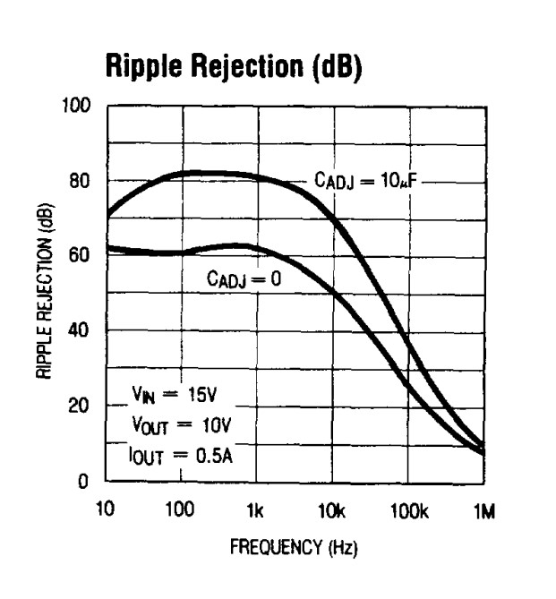 Поделитесь картинками давления грязи? Я не то чтобы сомневаюсь... Но все же заявляемые ТС 80 дБ подавления не совсем полная картина мира, ибо есть зависимость степени подавления пульсаций от частоты. Вот например даташит от Техас на 317. Как видно все преимущества вставки этого конденсатора кончаются в районе 8-10 кГц.