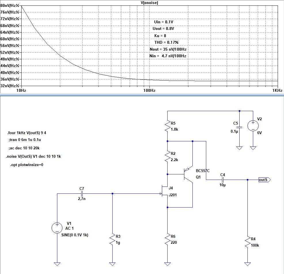Просимил у себя этот вариант :  приведённый ко входу Nin = 4.7 nV/100Hz - типовой для подобных транзисторов, а вот THD мой сим показал 0.17% вместо 0.09% у тебя. Пока не пробовал оптимировать.