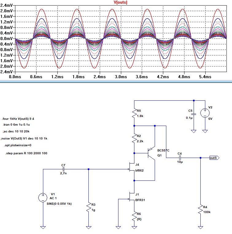 Схема ниже. J201 мне не нравятся, модели LSK170 у меня нет, поэтому поискал замену в виде BFT46. Искажения вполне достойные и на 100мВ, и на 200, и на 300. А шум не айс.