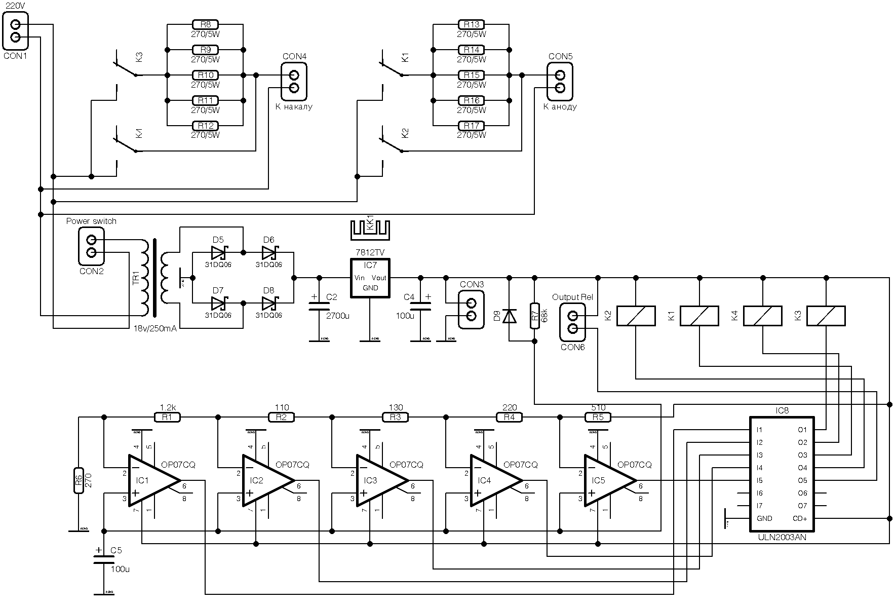 Буря эмоций и все мимо. Наверное следовало бы прочитать мой предыдущий пост, где я очень подробно описывал работу этой схемы. Но я могу еще раз повториться. Для анодов и накалов будут отдельные трансы! После батареи резисторов напряжение будет уходить на первички этих самых трансов: анодного и накального. А сама батарея служит для гашения подаваемого из сети напряжения. И одним резистором тут уж точно не обойтись.